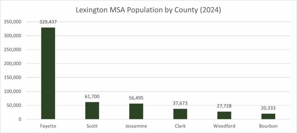 Home to 533,366 residents across 6 counties, the Lexington MSA is Kentucky’s second-largest metro and a thriving center for education, equine industries, advanced manufacturing, and healthcare. Strategically located in Central Kentucky along major interstate corridors, Lexington offers a pro-business climate, exceptional quality of life, and convenient access to two-thirds of the U.S. population within a day’s drive.