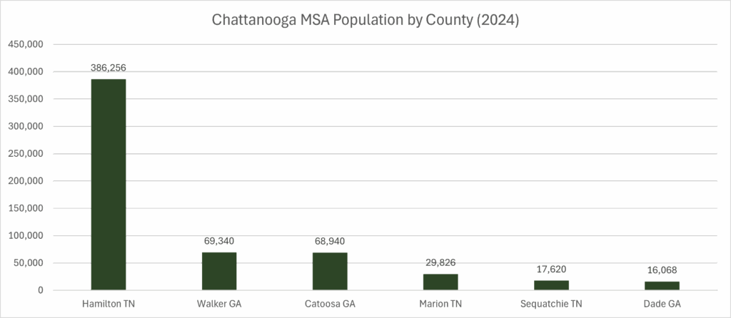 Chattanooga’s economy is anchored by six large sectors that collectively employ a significant portion of the region: Trade, Transportation & Utilities (20%), Manufacturing (20%), Education & Health Services (14%), Government (13%), Leisure & Hospitality (10%), and Professional & Business Services (10%). Major employers and economic pillars include Volkswagen (4,500 jobs), BlueCross BlueShield (4,145 jobs), Unum Group HQ (3,082 jobs), and Amazon (1,472 jobs), among others.