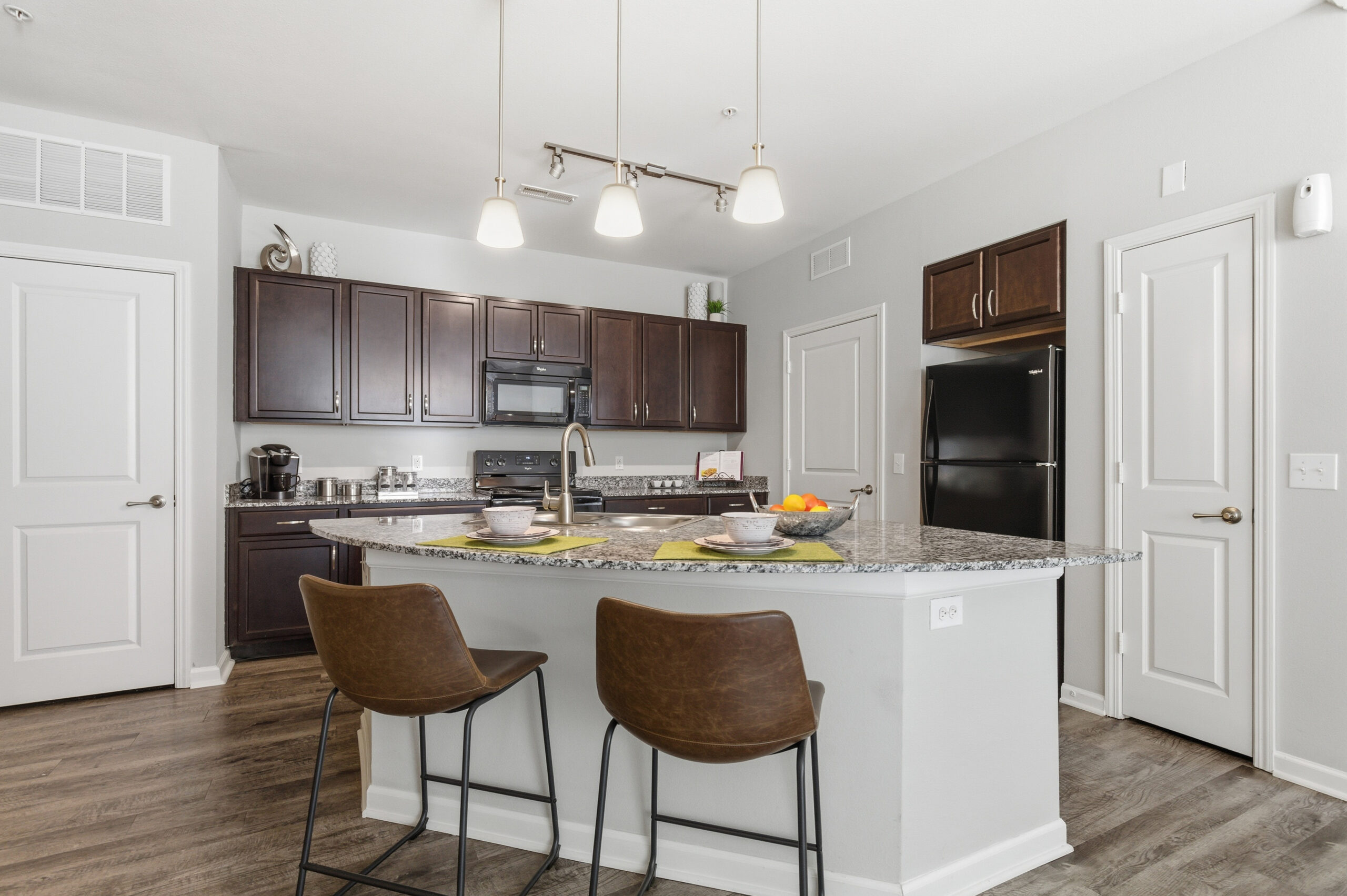 Hurstbourne Estates offers a full-service living experience with a robust amenity package, including a resort-style pool, fitness center, co-working space, game room, pet amenities, social lounges, and gated access. Each unit features private entrances, granite countertops with black appliances, shaker cabinetry, walk-in closets, and in-unit washer/dryers. Select homes also include double balconies, wood-style flooring, and dedicated storage—enhancing comfort and livability.
